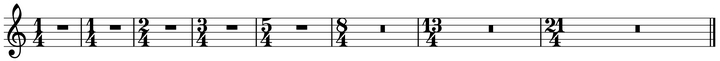 上の拍子の数はフィボナッチ数列になっているのですが、これは、下の①の箇所に当たります。この曲は、下の①~⑤からなる拍子と小節数(4分音符の総数にして377個)から出来ています。(説明のため①~⑤と書いていますが、曲が5つに分かれてるわけではないです)。