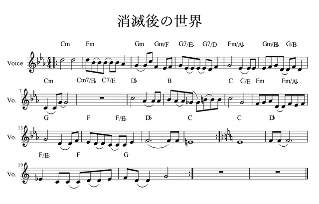 「消滅後の世界」は、1曲目の歌詞内容から随分時がたった、ある日の場面をイメージした歌詞で、主人公は「彼が見ている世界」のなかにいて、世界が「消えてゆく」ことで始まりを示唆してみた内容です。