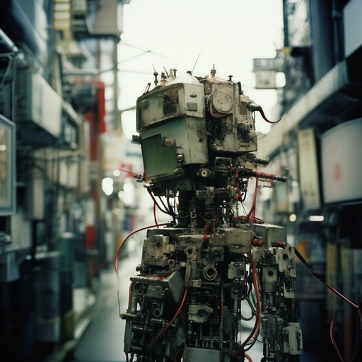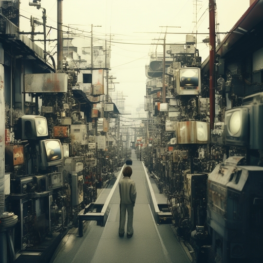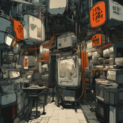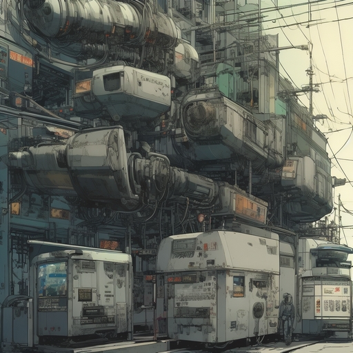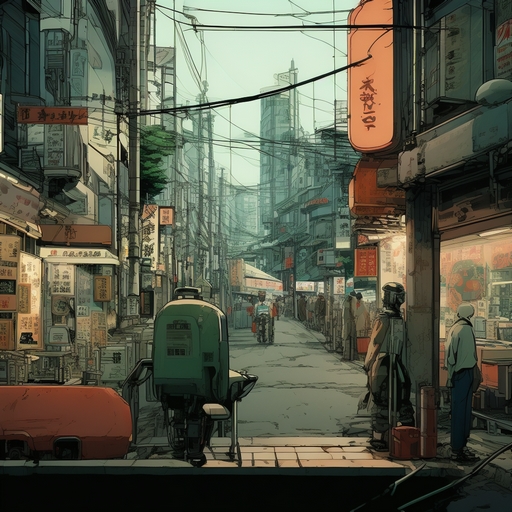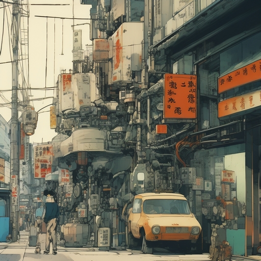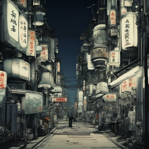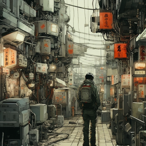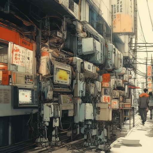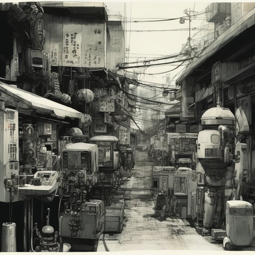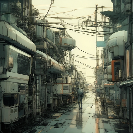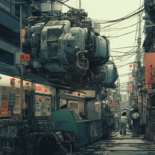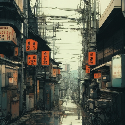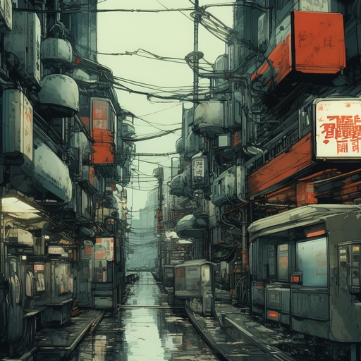 都市近辺の路地裏などの景観と用途不明な機械が混然としている感じの画像です。サイバーパンクの一種といえばよいのか。漢字の架空文字化がシュールさを助長している…。イラストのほかに実写も。
