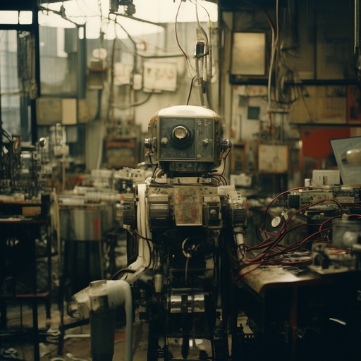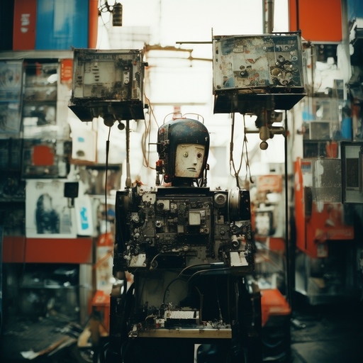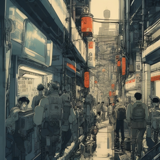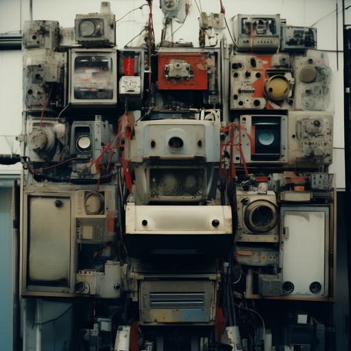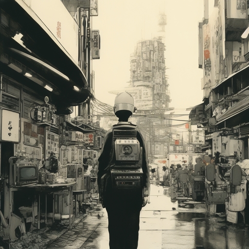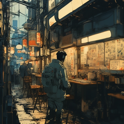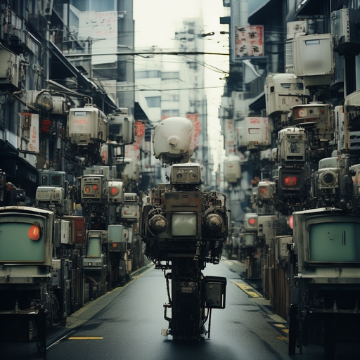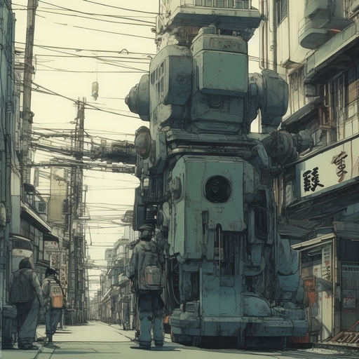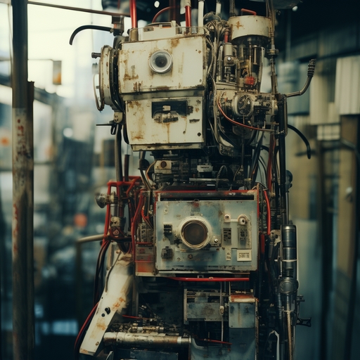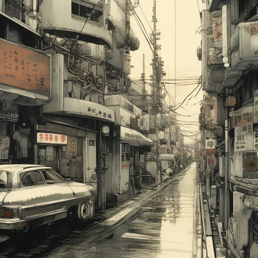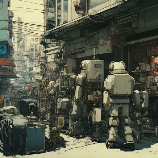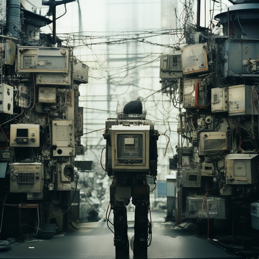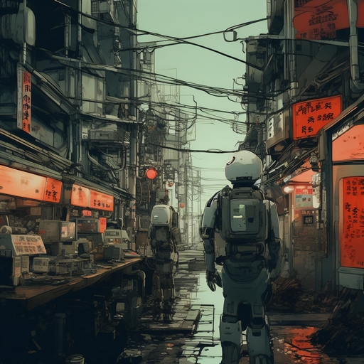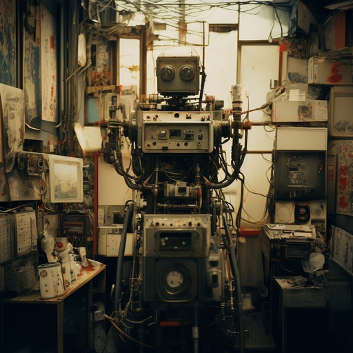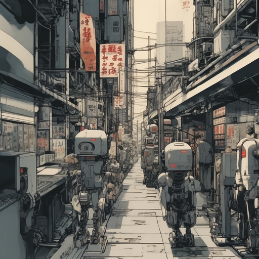 都市近辺の路地裏などの景観と用途不明な機械が混然としている感じの画像です。サイバーパンクの一種といえばよいのか。漢字の架空文字化がシュールさを助長している…。イラストのほかに実写も。